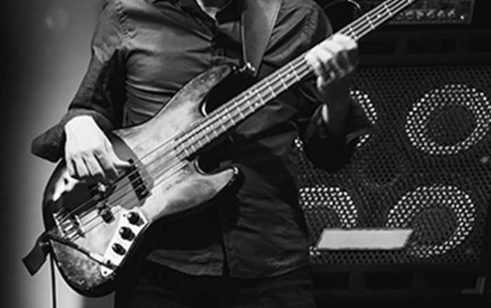 BASS GUITAR PLAYER ON A STAGE NEAR SPEAKERS